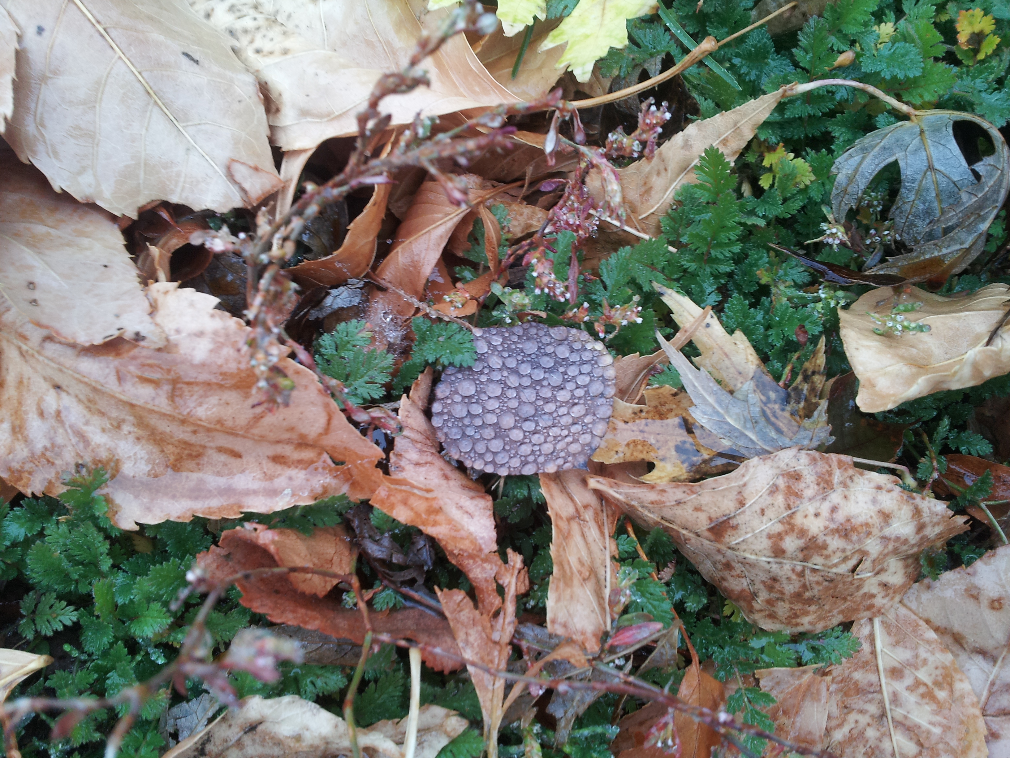 On a foggy fall walk I spotted this dew dropped aspen gem nestled among verdant life and decomposing leaves.